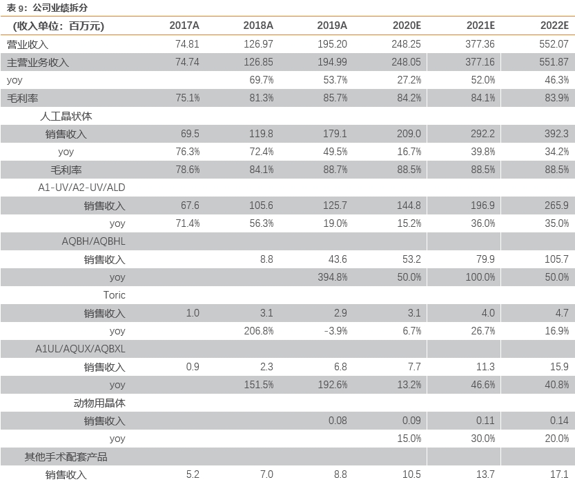 假设二:其他手术配套产品随人工晶状体销售保持较好的增长趋势,预计2020-2022年增速在20-30%。