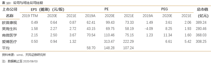 公司核心产品为人工晶状体与角膜塑形镜,且目前正处于成长阶段,未来有高成长的基础。我们选取目前已经上市的昊海生科(科创上市,业务板块包括眼科/医美/骨科/外科)与欧普康视(创业板上市,国内第一家角膜塑形镜获批企业)进行比较分析。