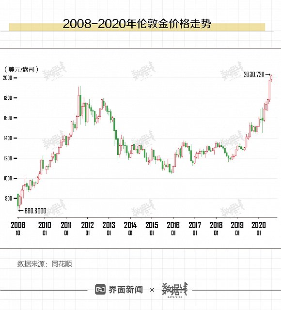 此前,现货黄金价格于7月27日突破2011年9月6日历史最高价1920.24美元/盎司,年内涨幅达26%。时隔9年,再次站上历史高点。