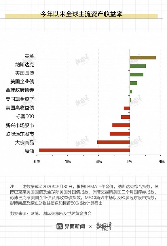 从收益率来看,今年以来黄金的收益率已远超纳斯达克、美国国债、标普500、新兴市场股市等全球主流资产。