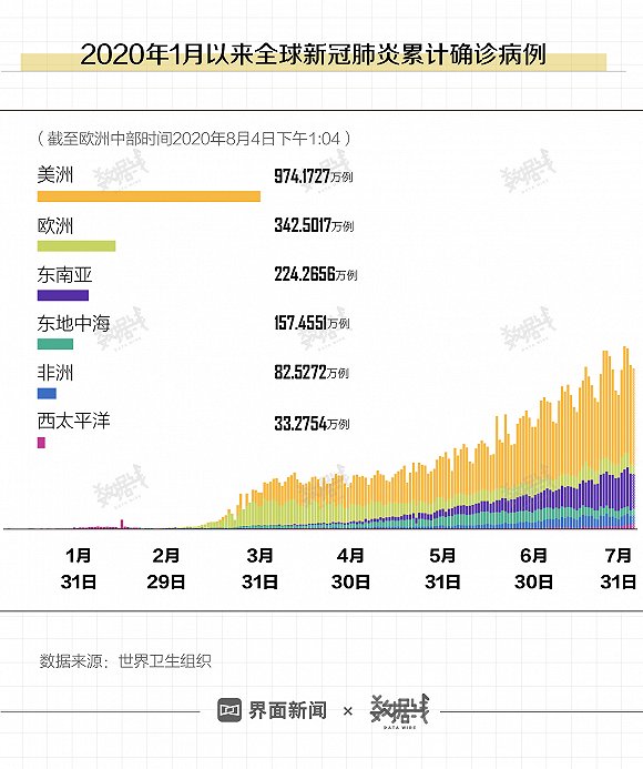据Worldometer实时数据,截至北京时间8月4日20时左右,全球新冠肺炎确诊病例达1847.9545万例,死亡病例69.8243万例。美国、巴西、俄罗斯等至少19个国家单日新增确诊病例数均超过千例。世界卫生组织总干事谭德塞8月3日表示,新冠疫情是一场“百年一遇”的健康危机。