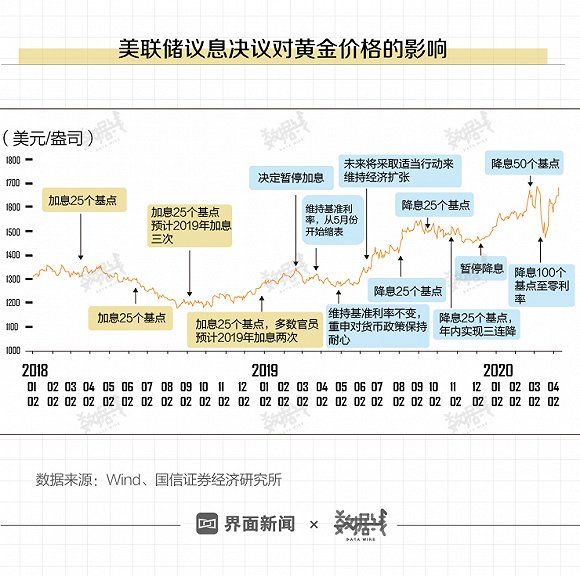 从历史数据来看,美联储降息决议对黄金价格影响较大。加息周期,金价震荡走弱,降息周期,金价持续走高。