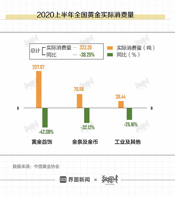 不过,对比往年“越涨越买”势头,今年黄金消费“熄火”了。中国黄金协会数据显示,2020年上半年,全国黄金实际消费量323.29吨,比去年同期下降38.25%。其中,黄金首饰、金条及金币分别同比下降42.06%、下降32.12%。