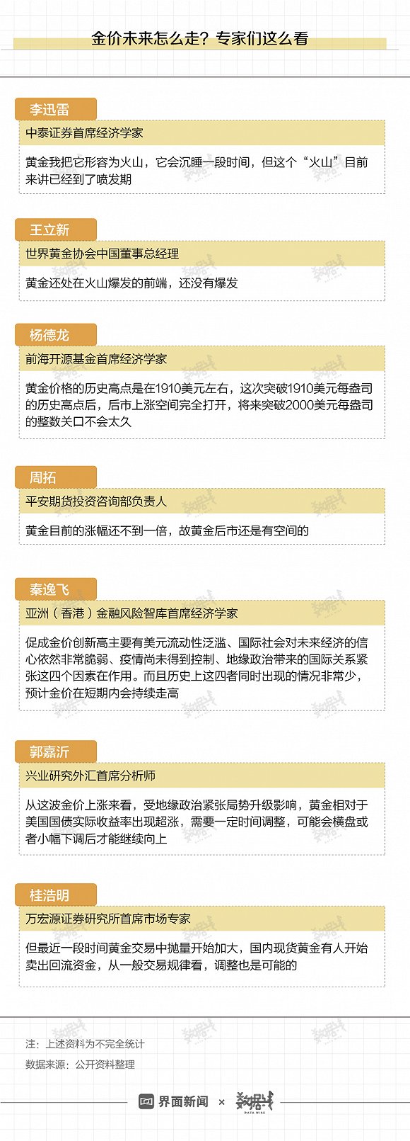 从新冠疫情爆发到现在(7月30日),金价上涨幅度尚不到30%。若计算通胀因素,目前的黄金价格并未达到历史高点。世界黄金协会中国董事总经理王立新认为,黄金还处在火山爆发的前端,还没有爆发。不过,也有专家认为,黄金可能会小幅下调后再继续上涨。