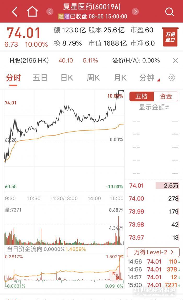受新冠疫苗概念拉动,复星医药近日股价持续走高。截至8月5日收盘,复星医药涨停,报收74.01元/股,市值1688亿。