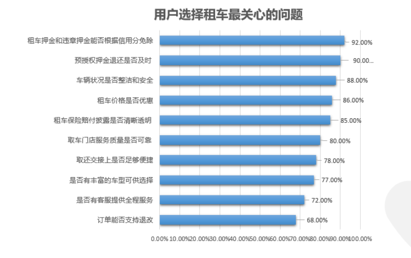 在租车阶段,用户对租车过程中的各项保障最为关心,超过90%的用户希望改变传统的租车押金模式。同时,在车况、租车价格、车型等传统关注点外,租车保险赔付披露是否清晰透明、取车门店服务是否可靠、是否有客服提供全程服务、订单能否支持退改等的呼声也很强烈。