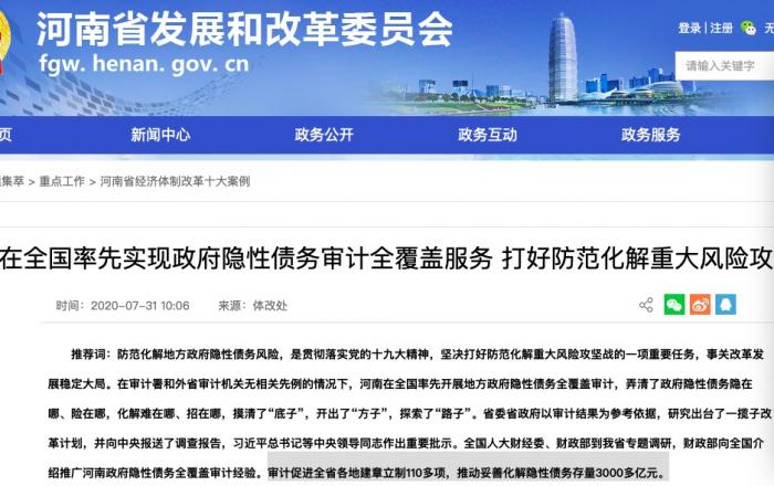 河南省发改委网站日前发布的文章称,2018年河南省探索创新采用省审计厅统一组织领导、市县审计机关异地大交叉的方式,在全国率先开展地方政府隐性债务全覆盖审计。全国人大财经委、财政部到该省专题调研,财政部向全国介绍推广河南政府隐性债务全覆盖审计经验。