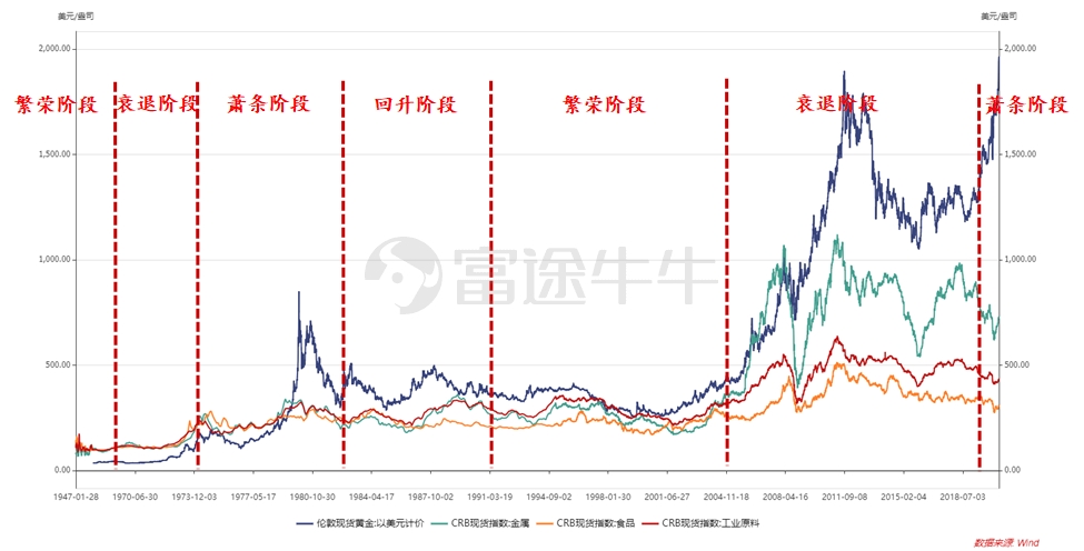 本轮长波周期衰退转向萧条阶段,与1970年开启的10黄金牛市处在同一个周期维度;衰退期资产收益率下跌,浪潮退去,随之而来的是全球实体信用和货币信用恶化,叠加疫情下美国无限量量化宽松政策以及全球负利率蔓延,历史仿佛以一个似曾相识的情景再次上演。黄金资产的相对收益优势得以体现,黄金走势也很可能复制1970年代的超级牛市。