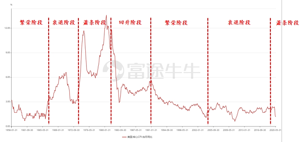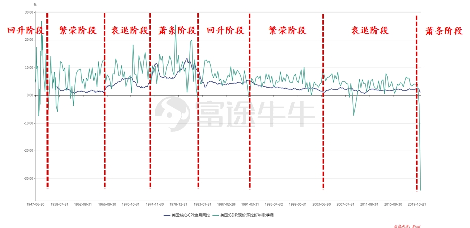 进入2020年,美股熔断,无限量QE,石油期货下跌至负数,世界经济和地缘政治陷入深深的危机之中。经济指标中,滞胀转向通缩——衰退转向萧条的领先指标信号出现,在这荒乱的年份,黄金的涨幅再次刷新。