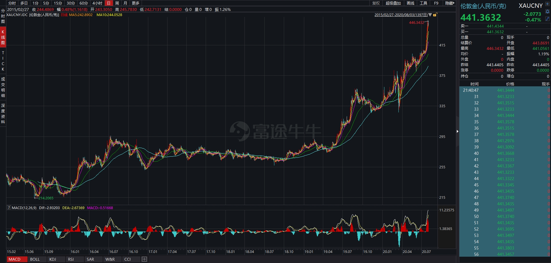 2016年3月16日至2020年8月3日,伦敦金(XAUCNY)累计上涨了175.5人民币/克,涨幅66.35%。