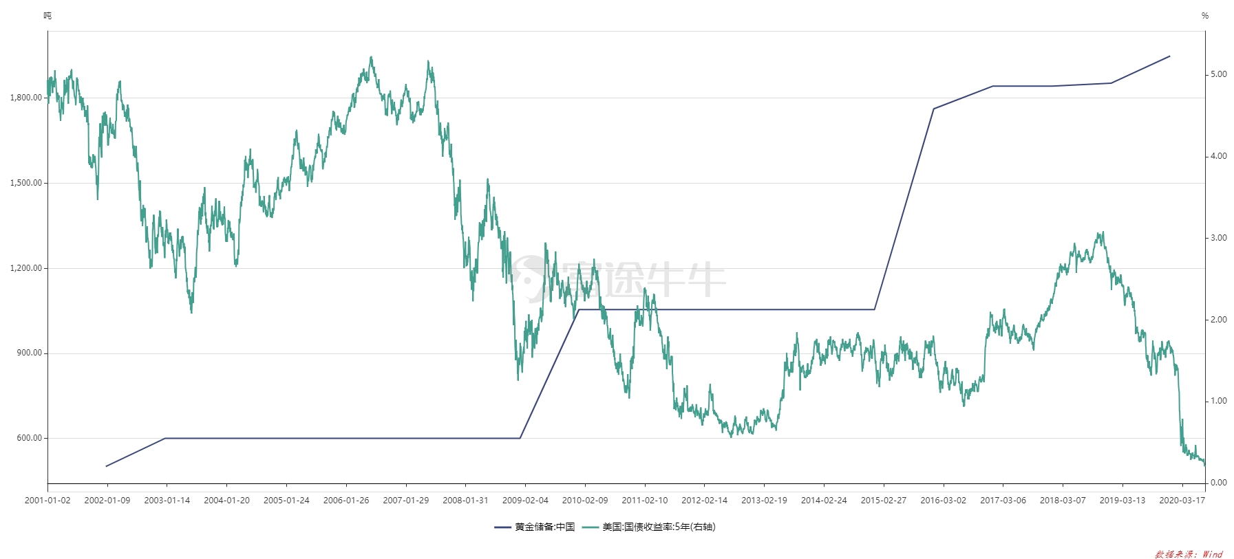 2015-2019年,美债收益率波动较大,央行在2015年6月和2018年12月美债收益率下行阶段分别进行了2次黄金增持,其中2015年的黄金储备上涨了74.80%,涨幅较大,且这一阶段的黄金储备与外汇储备呈现反向变动。