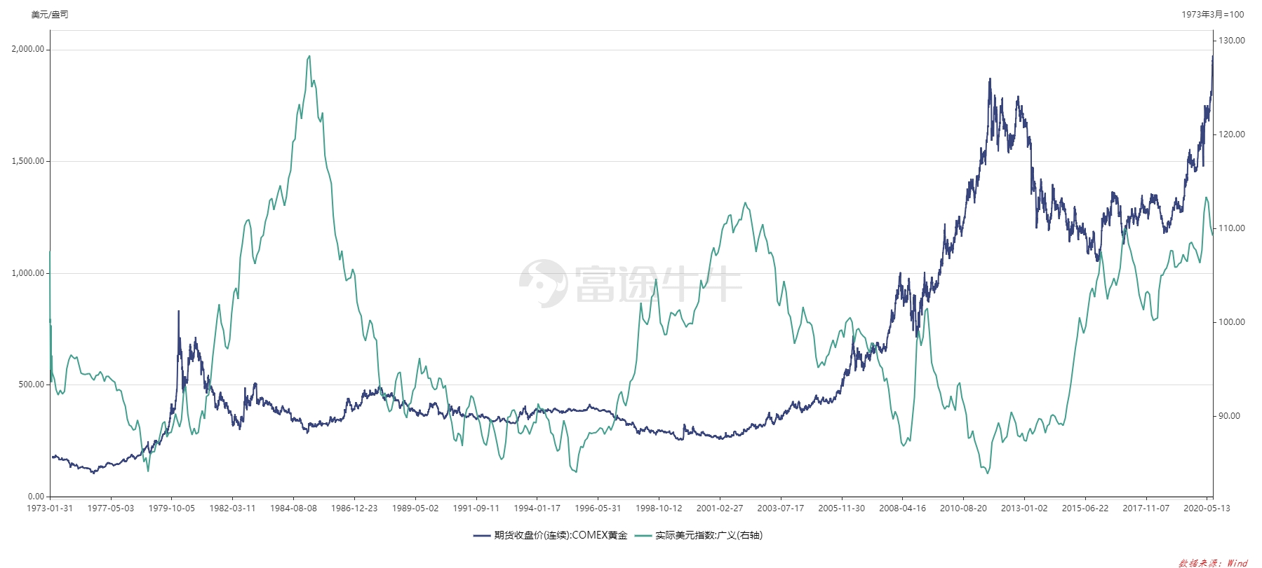 20世纪70至80年代正值上一轮康波周期的衰退晚期到萧条期,黄金在与美元的对抗中占尽上风,黄金市场迎来了10年的超级牛市,期间名义金价翻了20倍。1980年1月21日,黄金价格一路扶摇直上,出现每盎司850美元的高位。