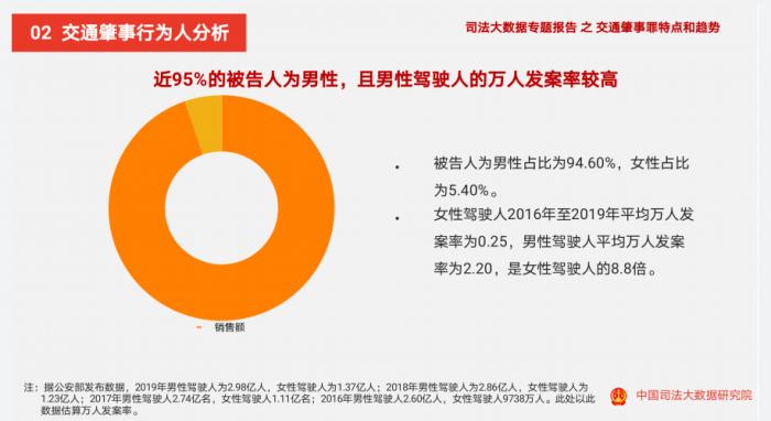 8月6日,司法大数据研究院对外发布的《交通肇事罪特点和趋势(2016.1-2019.12)》司法大数据专题报告显示,交通肇事罪被告人中,被告人为男性占比为94.60%,女性占比为仅为5.40%。女性驾驶人2016年-2019年平均万人发案率为0.25,男性驾驶人平均万人发案率为2.20,是女性驾驶人的8.8倍。