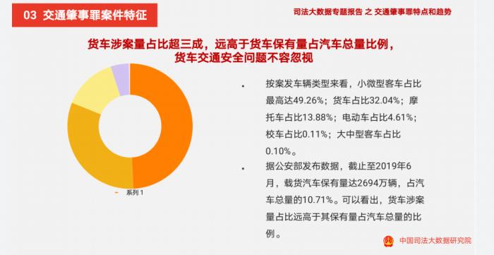 按案发车辆类型来看,小微型客车占比最高达49.26%;货车占比32.04%;摩托车占比13.88%;电动车占比4.61%;校车占比0.11%;大中型客车占比0.10%。据公安部发布数据,截止至2019年6月,载货汽车保有量达2694万辆,占汽车总量的10.71%。可以看出,货车涉案量占比远高于其保有量占汽车总量的比例。