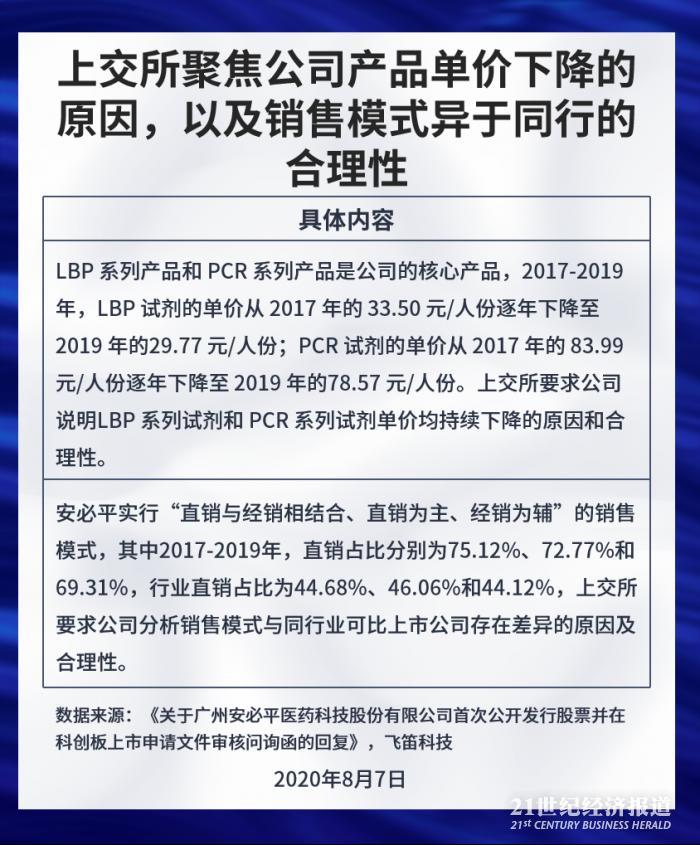 首先是产品单价下降的原因,LBP 系列产品和 PCR 系列产品是公司的核心产品,2017-2019年,LBP 试剂的单价从 2017 年的 33.50 元/人份逐年下降至 2019 年的29.77 元/人份;PCR 试剂的单价从 2017 年的 83.99 元/人份逐年下降至 2019 年的78.57 元/人份。上交所要求公司说明LBP 系列试剂和 PCR 系列试剂单价均持续下降的原因和合理性。