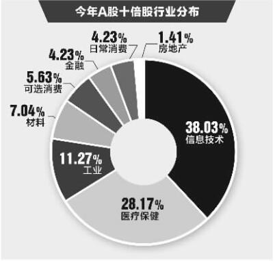 医疗保健、可选消费、日常消费等行业,隶属于大消费板块,信息技术属于科技股。也就是说,今年消费科技股中合计有54只,占今年十倍股总数的76%。