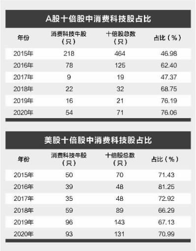美股市场上,截至今年7月底,十年十倍股合计共有131只,消费科技板块贡献93只,占比71%。2015年至2020年期间,美股市场各年度累计诞生十倍股509只,消费科技板块贡献392只,占比超过77%。其中,2016年消费科技股占比更是超过81%。整体来看,美股市场消费科技股十年十倍股占比在七成水平。