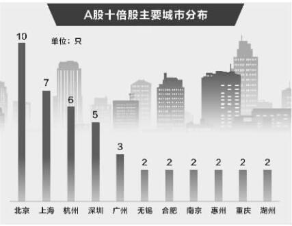 除此之外,A股市场十年十倍股还具有较强的地域属性。今年北上广深杭五个城市贡献的十年十倍股,合计有31只,占比近44%。其中,北京贡献10只、上海7只、杭州6只、深圳5只、广州3只。
