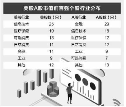此外,在市值前百强的公司中,A股更多的是金融股。数据显示A股在市值前百强的公司中,信息技术行业股票数为18只,医疗保健股票数为12只,最多的是金融股为29只;美股方面(剔除非美国公司),市值百强榜中信息技术行业股票数最多,为25只,医疗保健其次,股票数12只。