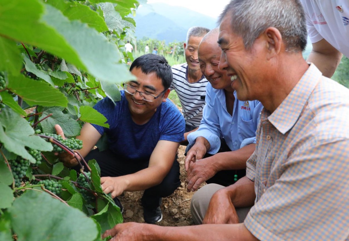 驻村第一书记刘叶阳和村民查看山葡萄长势。 李志涛 摄