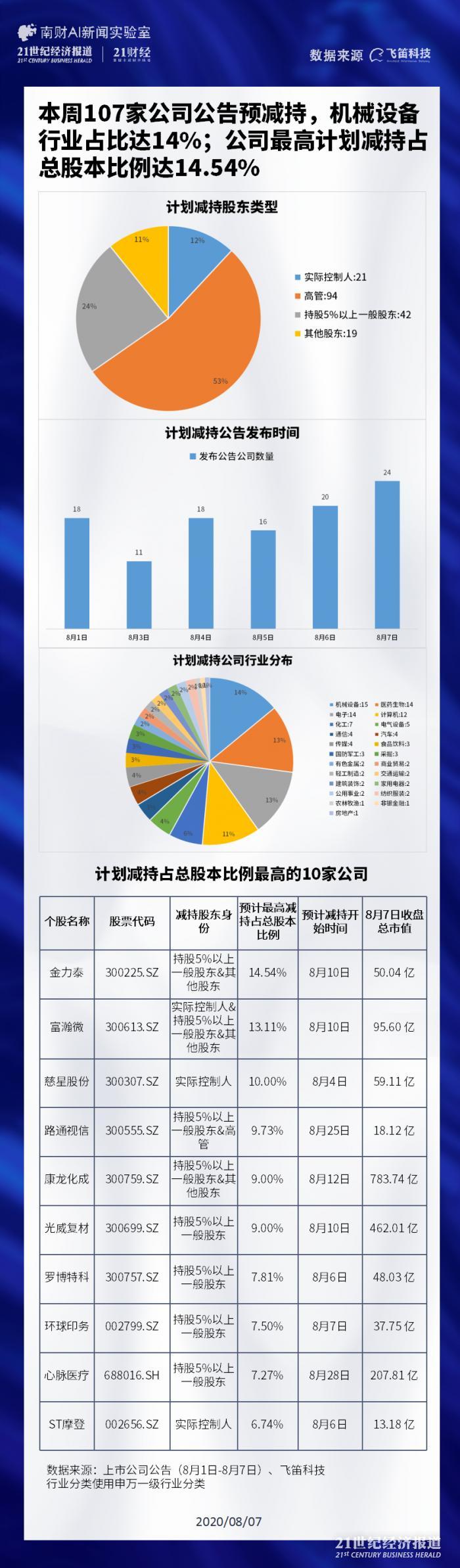 飞笛科技统计了8月1日-8月7日收盘时间区间内发布的上市公司公告中,计划减持比例最高的10家公司。分别为金力泰(300225.SZ)、富瀚微(300613.SZ)、慈星股份(300307.SZ)、路通视信(300555.SZ)、康龙化成(300759.SZ)、光威复材(300699.SZ)、罗博特科(300757.SZ)、环球印务(002799.SZ)、心脉医疗(688016.SH)、ST摩登(002656.SZ)。