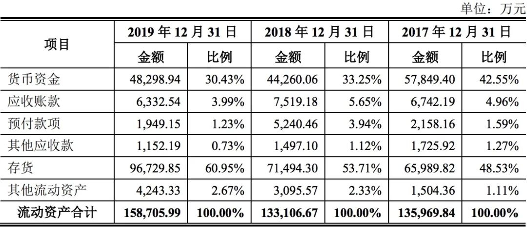 此外,据招股书可知,报告期内,中茶股份存货账面价值分别为6.60亿元、7.15亿元和9.67亿元,占总资产比例逐年递增,分别为38.38%、39.64%和45.75%。占流动资产的比例更是增至超六成,分别高至48.53%、53.71%和60.95%。