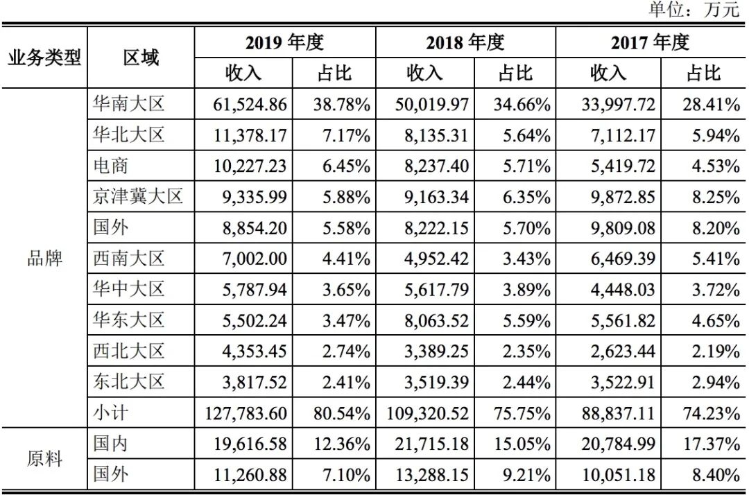 据招股书数据显示,中茶股份来源于华南大区(包括广东、广西、福建、海南等)的营业收入分别为3.40亿元、5.00亿元和6.15亿元,逐年递增,且占主营业务收入的比重分别高达28.41%、34.66%和38.78%,占比也不断见长。