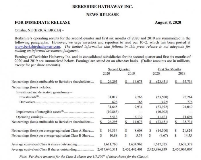 北京时间8月8日晚间,巴菲特旗下公司伯克希尔·哈撒韦(BRK.A.US)公布二季度财报。