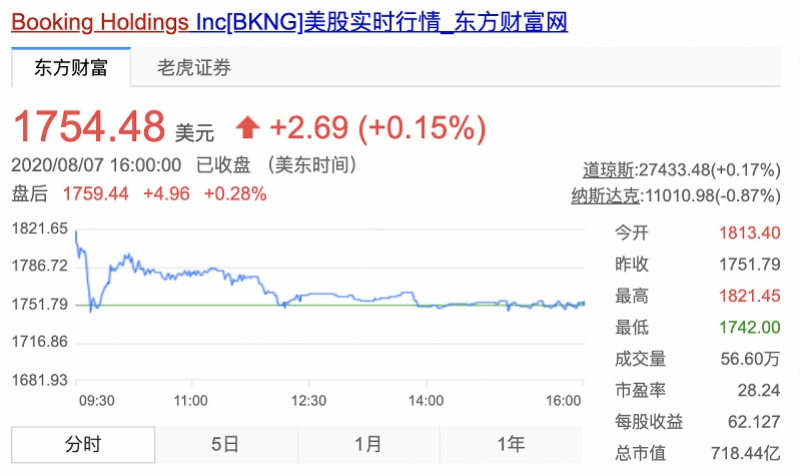 Booking Holdings(BKNG.US)美东时间开盘1813.4美元,截至今天(8月8日)发稿前,报1754.48美元/股,市值718.4亿美元。其股价今年以来已累计下跌近20%