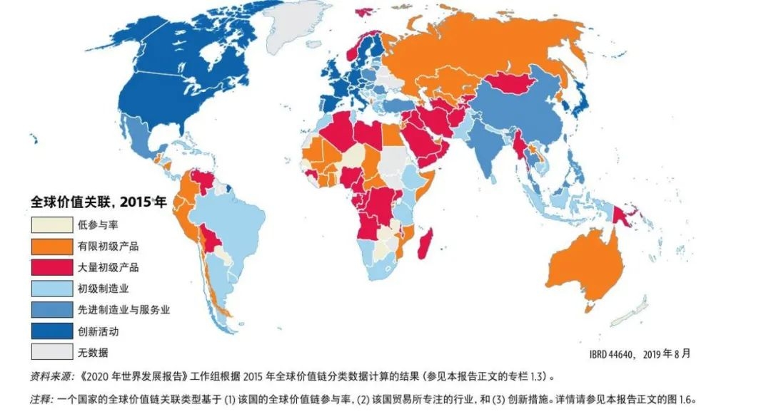 在今年世界银行出版的《2020年世界发展报告》中,他们根据2015年的全球价值链数据对不同国家和地区的在全球分工中所处的位置做了分类。如红色部分表明这些国家和地区以出口大量初级产品为主,中国被标为中蓝色,属于提供先进制造业和服务业为主的国家,深蓝的日本、美加和欧盟则以提供技术密集型的产品出口为主。
