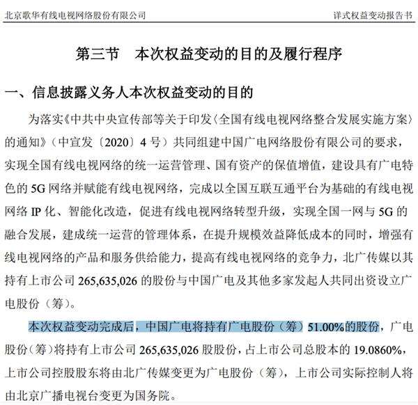 6月初公告的协议显示,北广传媒投资发展中心将以其持有的歌华有线19.09%股份出资共同发起组建广电股份。若本次出资实施完成,歌华有线控股股东将由北广传媒投资发展中心变更为广电股份,上市公司实际控制人将由北京广播电视台变更为国务院。
