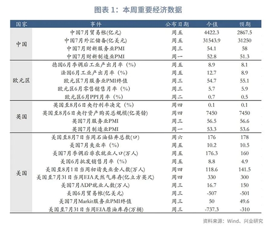 本周各国公布的经济数据总体比较平稳,美国7月新增非农就业176.30万,好于预期的增加148万,但远不及前值的增加480万;美国7月失业率降至10.20%,低于预期的10.60%,前值为11.10%。美国上周除却战略储备的商业原油库存减少737.3万桶至5.186亿桶,上周原油库存减少858.7万桶至5.2亿桶。欧元区公布6月PPI月率为0.7%,高于预期0.5%。欧元区7月制造业PMI终值实际值51.8,预测值51.1,前值51.1。欧元区7月制造业PMI终值创2018年11月以来新高。欧元区工厂报告显示第三季度开局表现非常积极。中国7月财新制造业PMI52.8,为九年半来最高,预期51.1,前值51.2。7月局部疫情反弹不改国内整体向好的大趋势,经济修复仍在持续,供给、需求两侧同步向好。