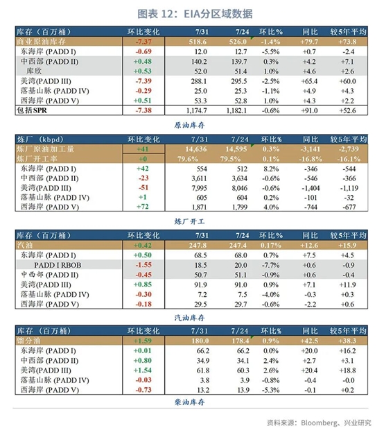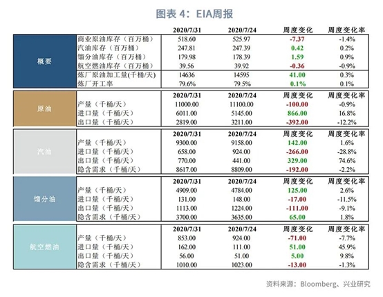 本周三公布的截至7月31日的EIA库存数据显示,美国原油库存减少737万桶至5.186亿桶,预期减少310万桶,前值减少1061.1万桶。汽油库存增加42万桶至2.4781亿桶。馏分油库存增加159万桶至1.7998亿桶。进出口方面,本周原油进口量增加86.6万桶/天至601.1万桶/天,原油出口量减少39.2万桶/天至281.9万桶/天。汽油进口量减少26.6万桶/天至65.8万桶/天,汽油出口量增加32.9万桶/天至77万桶/天。需求方面,汽油需求环比减少19.2天至861.7万桶/天,柴油需求环比增加6.5万桶/天至370万桶/天,航空燃油需求环比减少1.3万桶/天至101万桶/天。