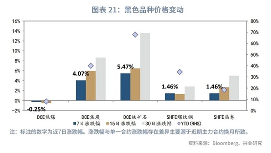 走势回顾:本周焦煤下跌0.25%,焦炭上涨4.07%;铁矿石上涨5.47%,螺纹钢上涨1.46%;热卷上涨1.46%。