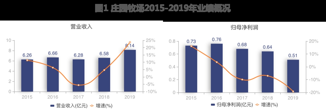 事实上,抛开2020年疫情的影响,根据历年财报整理庄园牧场2015至2019年业绩概况(见图1),不难看出,庄园牧场从2017年登陆A股中小板以来,营业收入以及增速逐年递增的同时,其归母净利润却一降再降。