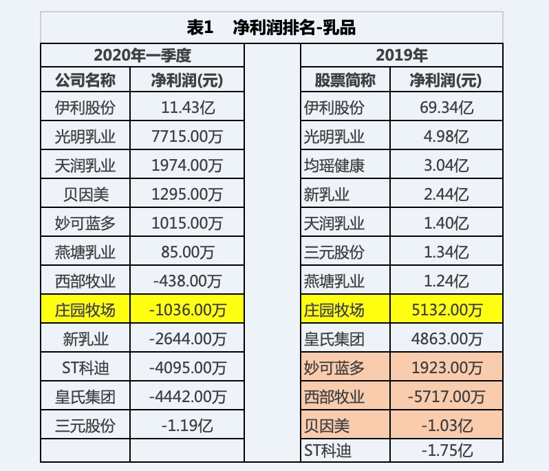 根据同花顺数据,2019年和2020年第一季度行业乳品名次排列(见表1)可以看出: