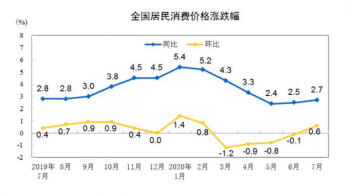 7月份,全国居民消费价格(CPI)同比上涨2.7%,比上月回升0.2个百分点,连续两个月小幅走高。市场普遍预计,CPI下半年会趋势性走低,不过短期受疫情、南方洪水等影响,食品价格短期有所走高。