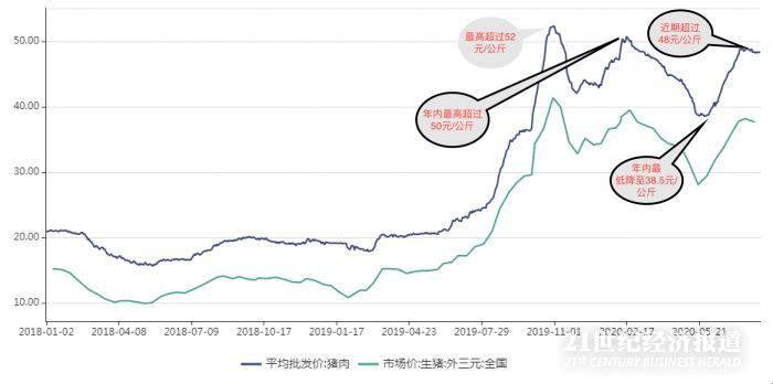 农业农村部数据显示,7月末全国猪肉平均批发价已经超过48元/公斤,相较5月末年内低点(38.5元/公斤)有明显回升。不过,7月末的猪肉价格仍低于年内高峰,也稍低于去年10月底的历史新高。从8月第一周趋势来看,猪肉价格有小幅回落的趋势。