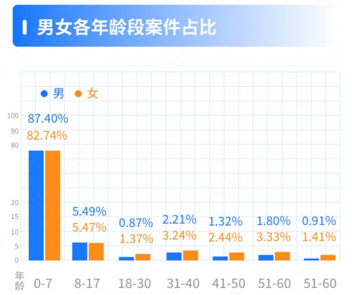 与重疾险不同,医疗险的理赔案件则重点集中在了0-7岁的幼年人群,男女的比例分别达到了87.4%和82.74%。免疫系统尚未成熟的他/她们,易被生活环境的各种因素感染致病,需要父母和保险的多重保护。