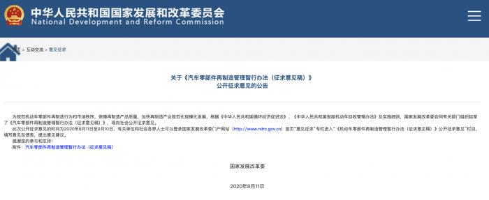 这一办法的出台是为了规范机动车零部件再制造行为和市场秩序,保障再制造产品质量,加快再制造产业规范化规模化发展。此次公开征求意见的时间为2020年8月11日至9月10日。