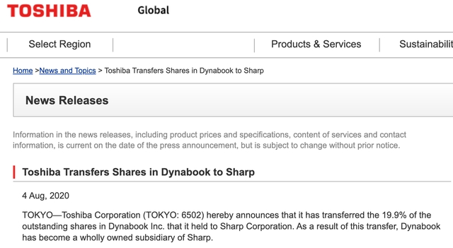 据TheVerge 8月9日报道,2年前,东芝将其80.1%的电脑业务股份以3600万美元的价格卖给了夏普,夏普将这一部门重新命名为Dynabook。2020年6月,夏普行使了购买东芝剩余19.1%股份的权利,东芝在8月4日发布声明称,交易已经完成。
