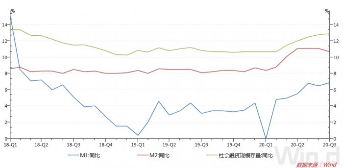 M1:狭义货币供应量,等于M0+企事业单位活期存款;