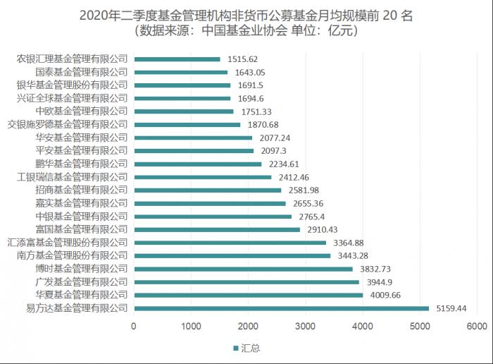 整体而言,基金管理机构非货币公募基金月均规模前20名的管理规模均在1500元亿以上,累计管理规模达53656.45亿元,相比上季度47080.97亿元,增加了6575.48亿元。