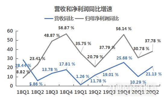 上图是2018年以来,分季度公司的收入和归母净利润的同比增速,从图中可以看到,公司的收入增长相对稳定,2020年一季度虽然增速放缓,但是二季度已经恢复到了21.13%。