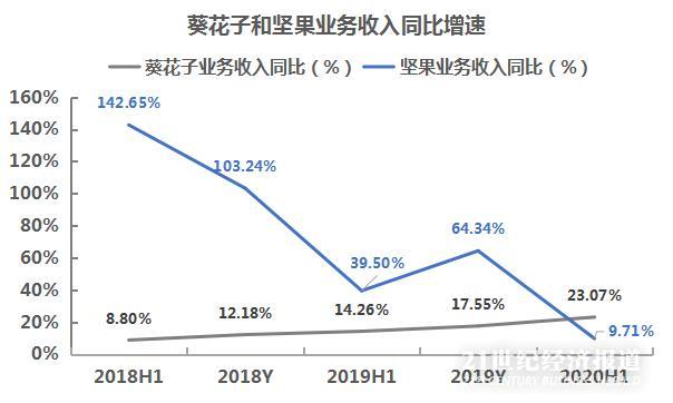受疫情影响,今年上半年,受益于居家时间增加的葵花子业务收入增速提升到23.07%;但疫情影响人们社交出行,跟社交馈赠需求相关的坚果业务收入增速则回落到只有9.71%。