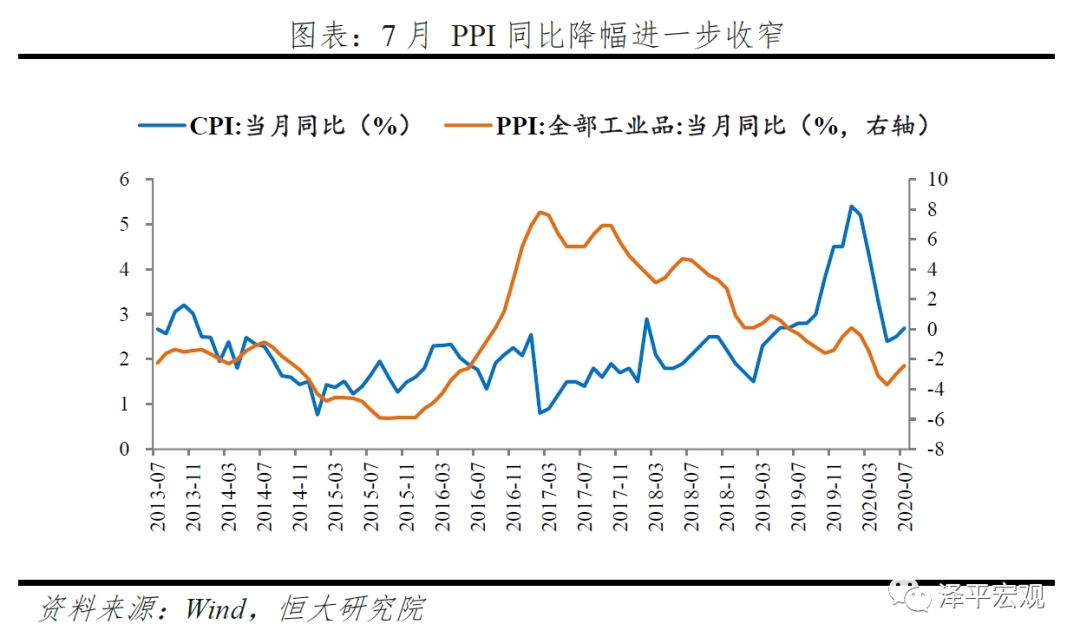 PPI跌幅持续收窄,CPI受供给冲击短暂上行,核心CPI仍继续下滑。7月PPI环比0.4%,同比降幅进一步收窄至-2.4%,下半年海外经济逐步恢复、国内基建投资支撑需求,预计PPI同比震荡回升。7月CPI环比转正至0.6%、同比小幅回升至2.7%,主要受猪肉、鲜菜价格短暂上涨影响,核心CPI仍继续下行。下半年随着翘尾因素下滑,CPI同比将继续回落。CPI回落+PPI回升的组合处于政策合意区间,货币政策将更加关注包括房价、股价在内的广义通胀和金融稳定。
