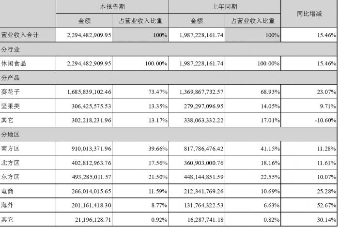 报告期内,休闲食品总体毛利率32.04%,比上年同期增长0.29%,维持平稳增长。其中,葵花子产品毛利率为33.09%,比上年同期下降2.19%,坚果类产品毛利率为26.92%,比上年同期增长5.66%。