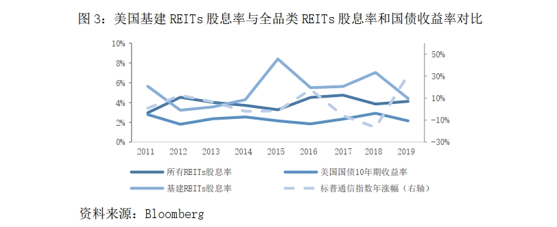 美国市场的数据显示,最近五年(2015.6-2020.6)基建REITs的年化收益率高达18%,波动率超过20%,高收益伴随高波动。主要因为美国基建REITs的是以运营通信设备的公司型REITs为主,有较强的权益资产特点。