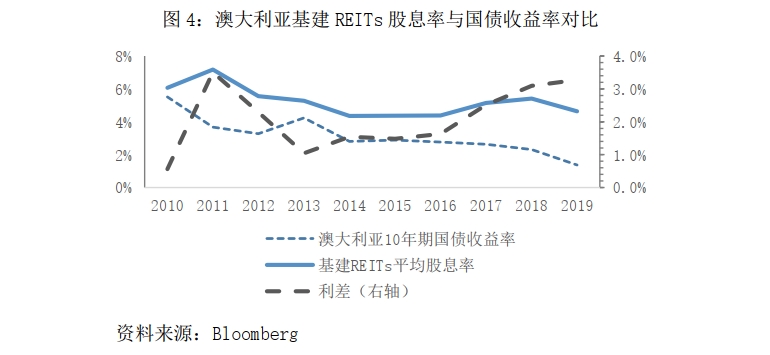 澳大利亚基建基金以持有多样化资产为主,最近十年(2010-2019)的股息率在4%-7%的区间内波动,高出国债利率2%,不仅在低利率环境下,能保证稳定的回报,而且波动率较低。