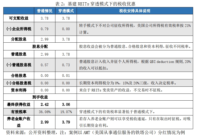 以美国的通信基建REITs为例,美国铁塔公司(AMT)在通信行业整体惨淡的2012年宣布转型为REITs,转型REITs后投资者可享受强制分红及穿透模式征税(免征企业所得税,有效税率显著低于普通模式)带来的收益,此外,养老金账户投资还可享受递延纳税的优惠,因此对长期资金和投资者的吸引力增强。而后同行业的冠城国际和SBA通信先后在2013年和2017年转型为REITs。